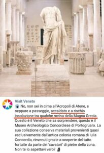 Polemica in Calabria dopo un post pubblicato sulla pagina Facebook di Visit Veneto per proumuovere il Museo Archeologico Concordiese di Portogruaro. “No, non sei in cima all’Acropoli di Atene, e neppure a passeggio, accaldato e a rischio insolazione tra qualche rovina della Magna Grecia. Questo è il Veneto che sa sorprendere, questo è il Museo Archeologico Concordiese di Portogruaro. La sua collezione conserva materiali provenienti quasi esclusivamente dall’antica colonia romana di Iulia Concordia, rinvenuti grazie a scoperte del tutto fortuite da parte dei ‘cavatori’ di pietre della zona. Non te lo aspettavi vero?“.