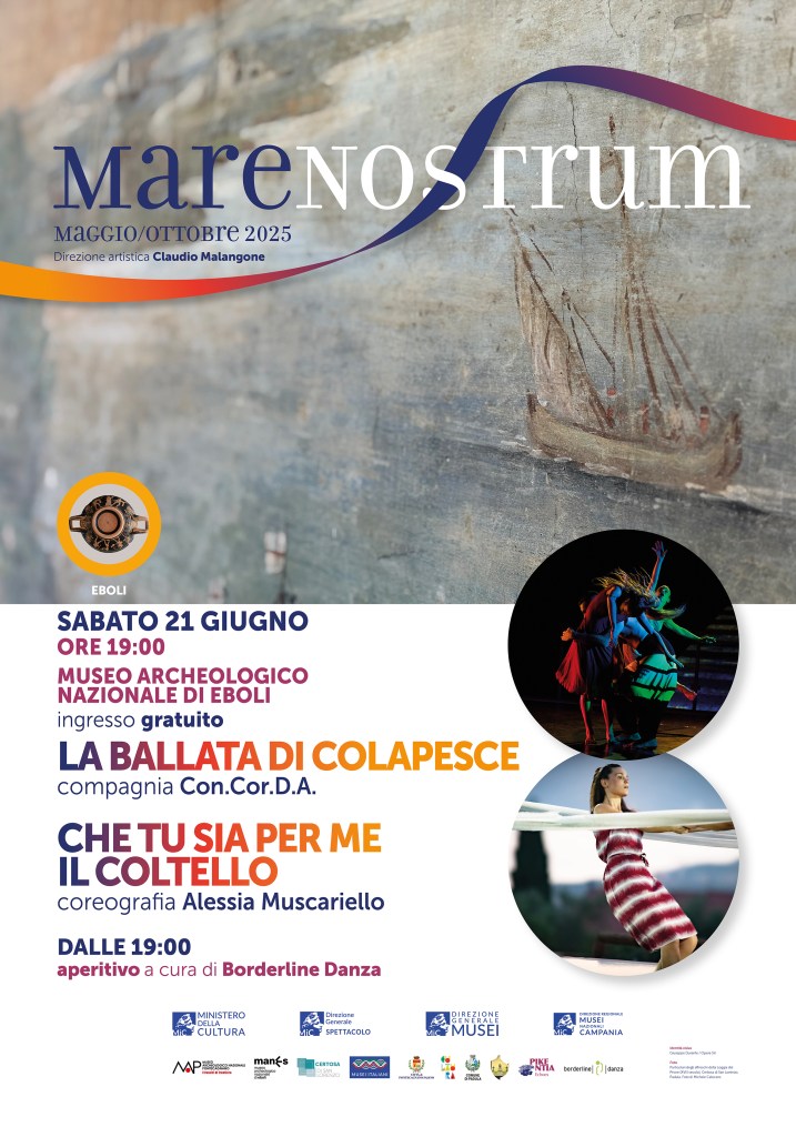 Sabato 21 giugno 2025, in occasione della Festa della Musica, organizzata da AIPFM – Festa della Musica Italia e finanziato dal Ministero della Cultura, il ManES – Museo Archeologico Nazionale di Eboli ospiterà, a partire dalle 19.00, il terzo appuntamento della rassegna internazionale di danza contemporanea “Mare Nostrum”, che si svolgerà fino a ottobre 2025 in suggestivi luoghi della cultura.