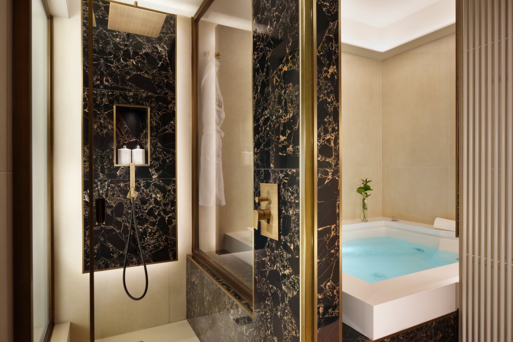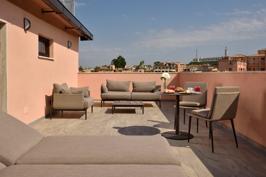 La suite rappresenta l’essenza del nuovo posizionamento dell’hotel: spazi iconici, dotazioni di alto livello, una Spa privata e una vista sul Colosseo e sul Rione Monti.