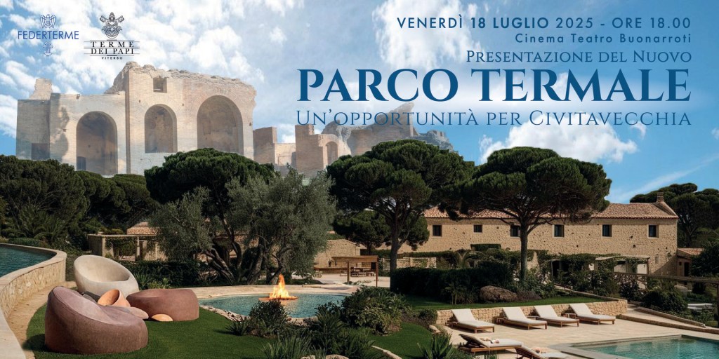 La presentazione “Parco Termale: un’opportunità per Civitavecchia”, aperta a tutti i cittadini, si terrà il prossimo 18 luglio alle ore 18.00 presso il Cineteatro Buonarroti (Via Buonarroti 13B, Civitavecchia).