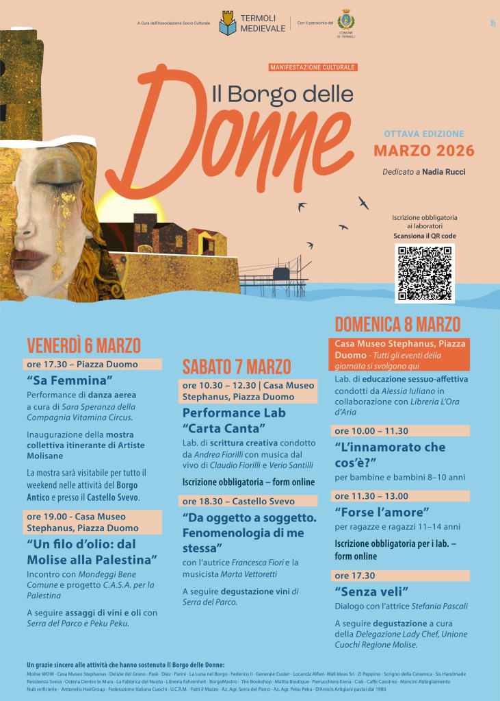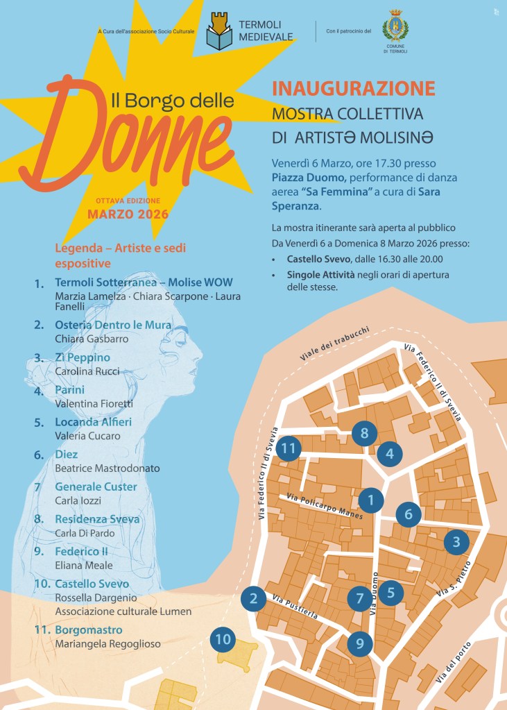 L’evento di apertura di questa edizione, previsto venerdì 6 marzo alle 17.30, vedrà protagonista Sara Speranza, giovane termolese della Compagnia Vitamina Circus. Si inizierà il weekend ‘in volo’ con la sua performance di danza aerea intitolata ‘Sa Femmina’. Contestualmente sarà inaugurata una mostra collettiva di 13 artiste molisane. Quest’anno la mostra sarà itinerante, aperta al pubblico per tutto il weekend presso il Castello Svevo e diverse attività commerciali del Borgo Antico che ringraziamo per la disponibilità e l’interesse mostrato verso la manifestazione.