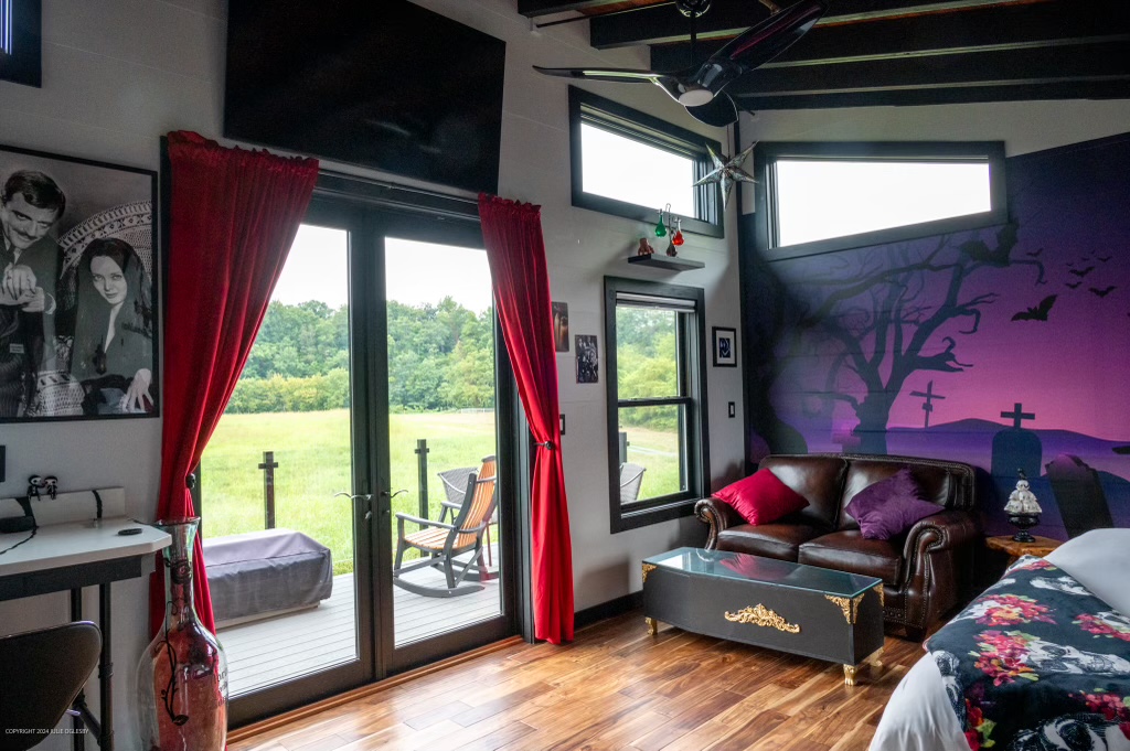 Perfetta per chi ama l’estetica dark, questa suite in Tennessee, costruita su palafitte, è un omaggio a Morticia e Gomez. Letto king-size in stile gotico, luci soffuse e divano in pelle creano un’atmosfera unica, tra romanticismo eccentrico e suggestione. I fan più attenti potranno divertirsi a scovare i 27 riferimenti ispirati alla serie e ai film. Affacciandosi dalla porta finestra, si apre un giardino silenzioso punteggiato da crocifissi e dettagli spettrali. Link all’alloggio: https://www.airbnb.it/rooms/1225244075862056146