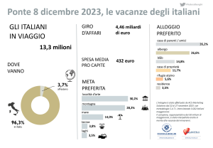 13 milioni 254 mila italiani hanno programmato una vacanza per la festività dell’8 dicembre, anche sfruttando il fatto che il giorno festivo capita proprio di venerdì, rendendo possibile allungare di un giorno il fine settimana. Chi ha deciso di partire, nella maggioranza dei casi (43,4%) quest’anno si è mosso con largo anticipo prenotando la vacanza un mese prima. Ma non è tutto: il progetto di viaggio è concentrato soprattutto in Italia (96,3%), principalmente nella propria regione o in regioni vicine al proprio territorio. Solo il 3,7% (vs 5,9% dello scorso anno) ha scelto destinazioni estere, solitamente concentrate nelle grandi capitali europee. La spesa media complessiva a persona per questo ponte è di circa 432 euro, con un giro di affari di 4 miliardi e 461 milioni di euro (+7,6% rispetto al 2022), secondo l’indagine realizzata per la federazione da ACS Marketing Solutions.