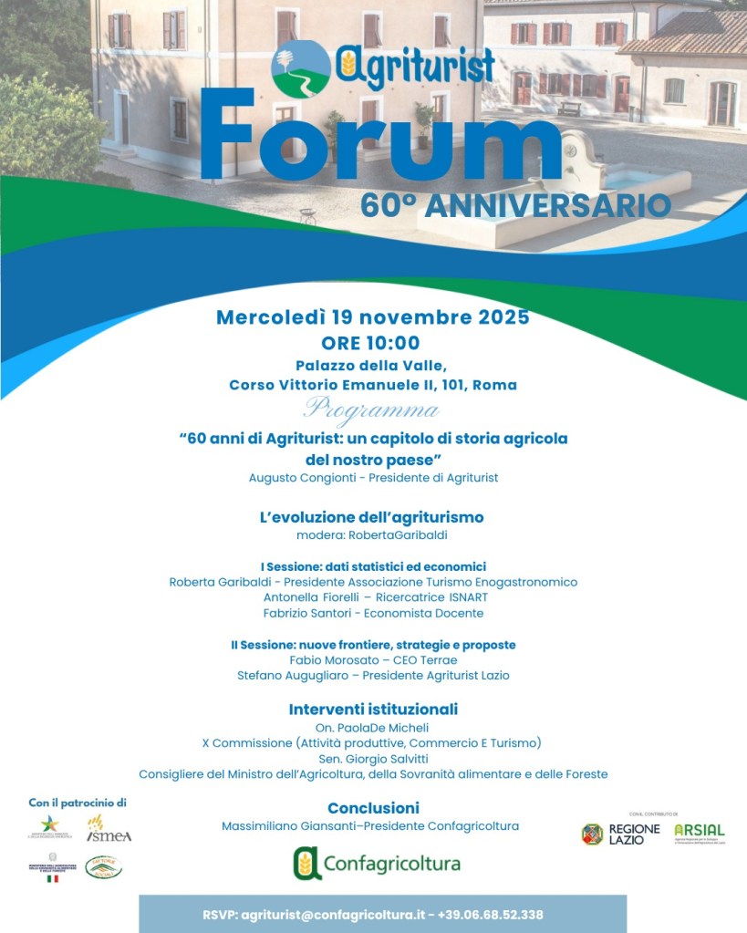 L’evento di punta delle celebrazioni sarà il convegno istituzionale dal titolo: “60 anni di Agriturist: un capitolo di storia agricola del nostro Paese”, in programma mercoledì 19 novembre a Roma, a Palazzo della Valle, alle 10. Un’occasione per ripercorrere la storia dell’Associazione, ma anche un importante momento di confronto sulle prospettive del turismo rurale e dell’ospitalità agrituristica, settori che oggi più che mai rappresentano un volano per la competitività dell’Italia nel mondo.