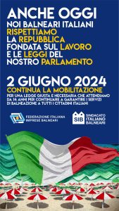 Domenica 2 giugno, Festa della Repubblica Italiana e avvio della stagione estiva 2024, inizierà la campagna estiva di mobilitazione degli imprenditori balneari aderente al Sindacato Italiano Balneari FIPE/Confcommercio e FIBA/Confesercenti.