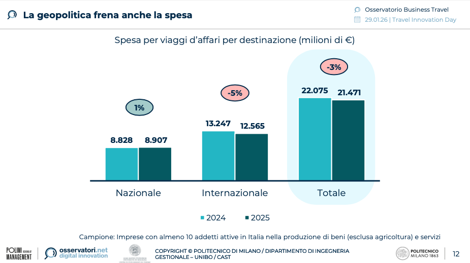 Il rallentamento del mercato travel italiano segna la fine di una stagione e l’inizio di un’altra. I dati della nuova edizione dell’Osservatorio Travel Innovation del Politecnico di Milano parlano chiaro: nel 2025 ospitalità e trasporti crescono ancora, ma a ritmi ridotti. Il Business Travel arretra del 3% e il numero delle trasferte diminuisce. Non è una contrazione congiunturale, ma una selezione strutturale.