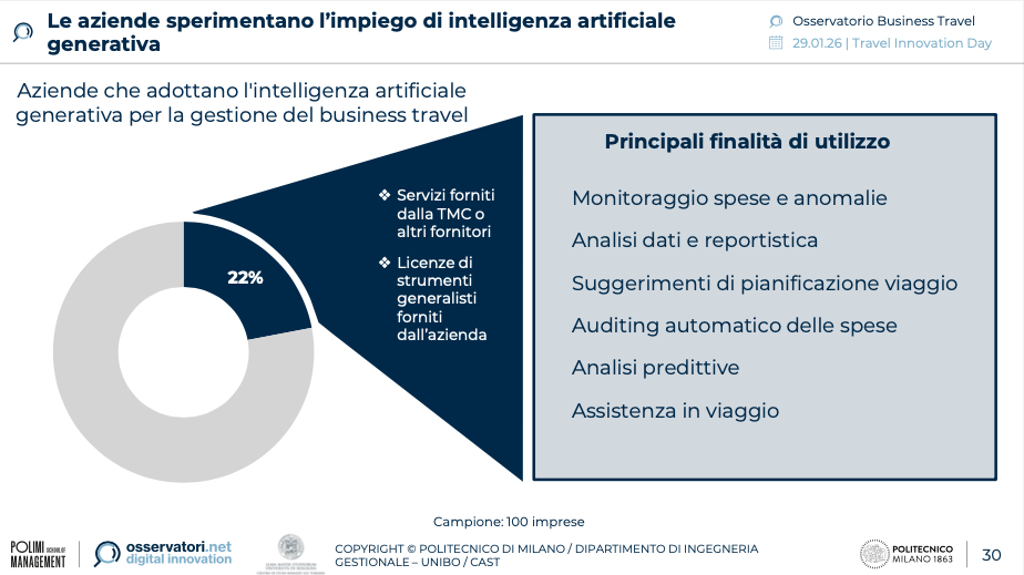 Nel frattempo, cresce rapidamente il ruolo dell’intelligenza artificiale. Un viaggiatore su tre utilizza già strumenti di IA generativa per pianificare il viaggio e l’85% li considera fondamentali. Eppure, come evidenziato dall’Osservatorio, l’impatto reale dell’AI nelle imprese resta ancora limitato: investimenti in aumento, risultati disomogenei, ritorni spesso difficili da misurare. È il cosiddetto AI Paradox.