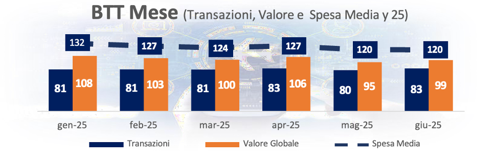 Il numero di transazioni mensili – ovvero il volume di viaggi d’affari effettuati – è rimasto costante tra gennaio e giugno, con un indice compreso tra 81 e 83 (dove 100 rappresenta il livello medio annuo). L’unica leggera flessione si è registrata a maggio, con un valore sceso a 80, recuperato però già a giugno, chiuso con un indice di 83.