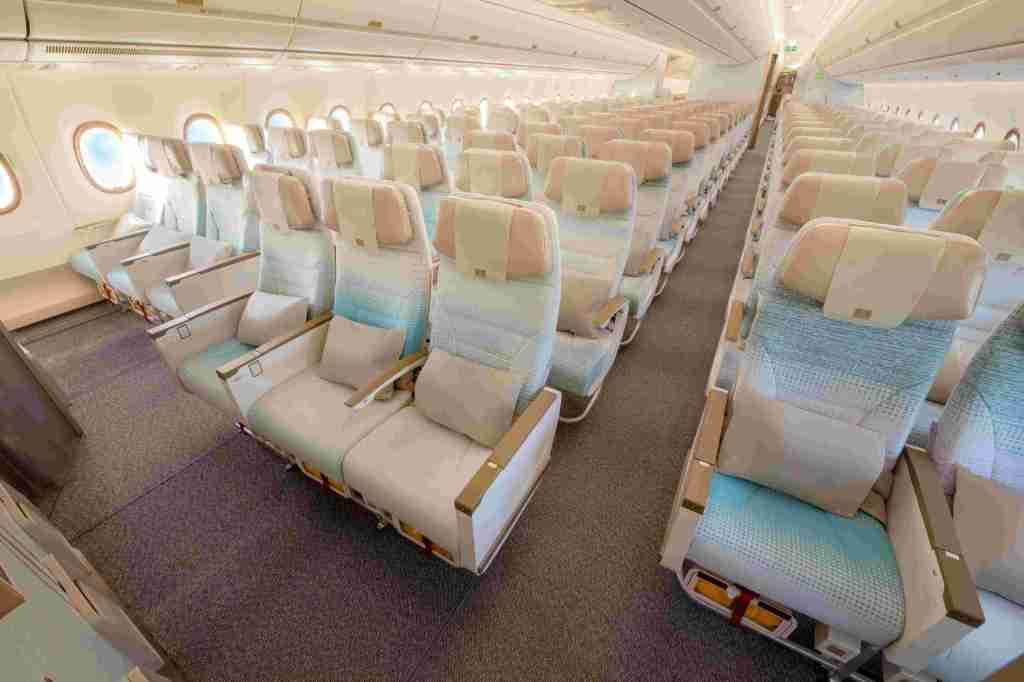 L’Emirates A350 a tre classi dispone di 312 posti: 32 poltrone di nuova generazione in Business Class completamente reclinabili, disposte in configurazione 1-2-1; 21 posti in Premium Economy in configurazione 2-3-2 e 259 spaziosi posti in Economy Class con layout 3-3-3. Progettato per offrire il massimo comfort, l’aeromobile presenta soffitti più alti, corridoi più ampi e una cabina più silenziosa.