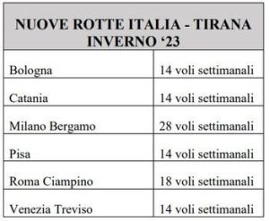 Ryanair ha annunciato 200 voli settimanali e 17 nuove rotte da/per l’Albania come parte dell’operativo per l’inverno ’23, tra cui Bologna, Catania, Milano Bergamo, Pisa, Roma Ciampino e Venezia Treviso per i viaggiatori in partenza dall’Italia.