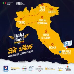 La prima tappa del Tour si è tenuta a Roma dal 30 giugno al 2 luglio 2022 con il supporto di Convention Bureau Roma e Lazio, mentre il tour proseguirà nei prossimi mesi toccando gran parte dell’Italia con tappe a Torino (dal 23 al 25 ottobre 2022 insieme a Convention Bureau – Turismo Torino e Provincia), in Emilia Romagna (insieme a inEmiliaRomagna), a Trieste (insieme a PromoTurismo FVG), a Siena (insieme a Convention Bureau Terre di Siena) e in Alto Adige (insieme a Meet Alto Adige). Le ultime tappe sono in attesa di formalizzazione e saranno presentate non appena confermate; così come le date complete del tour.