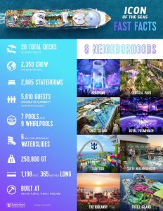 Icon offre una gamma completa di esperienze che combinano il meglio di ogni vacanza, dal ritiro su una magnifica spiaggia alla fuga in un resort e all’avventura in un parco a tema, capaci di rendere l’avventura unica nel suo genere che la nave propone la scelta perfetta per ogni tipo di famiglia e di viaggiatore. Nei suoi otto quartieri, vere e proprie destinazioni a sé, tante sono le novità e i grandi classici ideali, giorno e notte, davvero per tutti: emozioni adrenaliniche come quelle sui sei scivoli da record del Category 6 e l’esperienza Crown’s Edge a 44 metri di altezza sull’oceano, nonché tante opportunità senza paragoni per rilassarsi con sette piscine (una per ogni giorno della settimana), tra cui la prima piscina a sfioro sospesa sul mare. Le rivoluzionarie esperienze includono anche un quartiere dove si può trascorrere un’intera giornata progettato per le famiglie con bambini piccoli; più di 40 ristoranti, bar e aree lounge; un intrattenimento che è una vera e propria sfida tra i ponti in aria, sul ghiaccio, in acqua e a teatro e molto altro ancora.