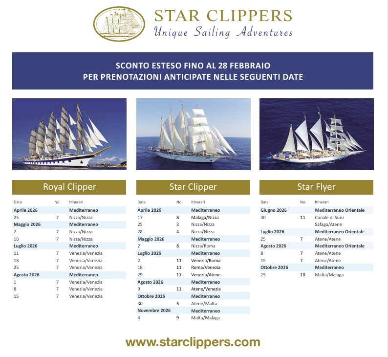 Su Star Flyer saranno quattro le crociere, in alta stagione sulle rotte Atene-Atene da sette notti, (25 luglio 2026, 1, 8 e 15 agosto 2026). Quattro partenze anche quelle a bordo di Star Clipper, sulle rotte da 11 notti Venezia-Civitavecchia del 2 luglio, Civitavecchia-Venezia del 18 luglio, Venezia-Atene del 29 luglio e Atene-Venezia del 9 agosto 2026.