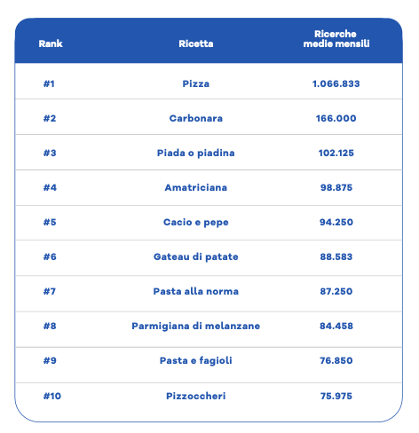 A guidare la classifica è la pizza, che domina con oltre 1 milione di ricerche mensili. Seguono la carbonara (166.000 ricerche/mese) e la piadina (oltre 102.000 ricerche), emblema del cibo da strada.