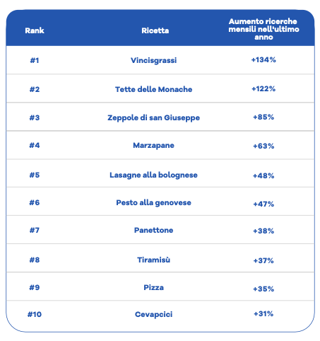 Se la classifica assoluta premia i capisaldi della cucina nazionale, la classifica delle ricette in maggiore crescita evidenzia una “riscoperta” di piatti locali, talvolta poco noti al grande pubblico. A guidare la top ten ci sono i vincisgrassi marchigiani (+134%) e le “tette delle monache”, dolce tipico pugliese (+122%). Crescono anche piatti della tradizione casalinga come le zeppole di San Giuseppe (+85%) e grandi classici reinterpretati come il pesto alla genovese (+47%).