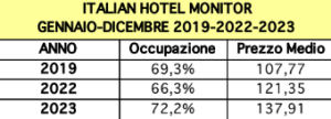 Secondo gli indicatori di Italian Hotel Monitor, elaborato da Trademark Italia, il quarto trimestre 2023 va in archivio con un risultato in crescita rispetto al 2022, sia in termini di occupazione camere (+2,6 punti) che di prezzo medio camera (+16,9%). Questi dati, insieme a quelli dei precedenti tre trimestri, consentono di chiudere il 2023 con numeri piuttosto significativi sia rispetto al 2022 (+5,9 punti di R.O. e +13,6% di ADR) che rispetto al 2019 (+2,9 punti di R.O. e +28,0% di ADR), consolidando ulteriormente il positivo trend del movimento turistico business ed ancor più di quello leisure internazionale, che ha continuato ad affollare le principali città d’arte e d’affari italiane.