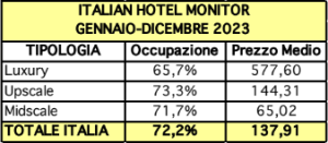 I dati IHM confermano un buon andamento in tutte le tipologie ricettive, con il settore luxury (5 stelle) che si attesta al 65,7% di R.O. (+5,0 punti vs 2022) e a 577,60 euro di ADR (+16,4% vs 2022), e il settore upscale (4 stelle) che con un ADR di 144,31 euro cresce del +10,9% mentre la R.O. al 73,3% fa registrare +6,8 punti rispetto al 2022. Segnali positivi anche per il settore midscale (3 stelle) che nel confronto con lo scorso anno vede incrementare la R.O. di +4,8 punti fino al 71,7% e il prezzo medio camera del +14,2% fino a 65,02 euro.