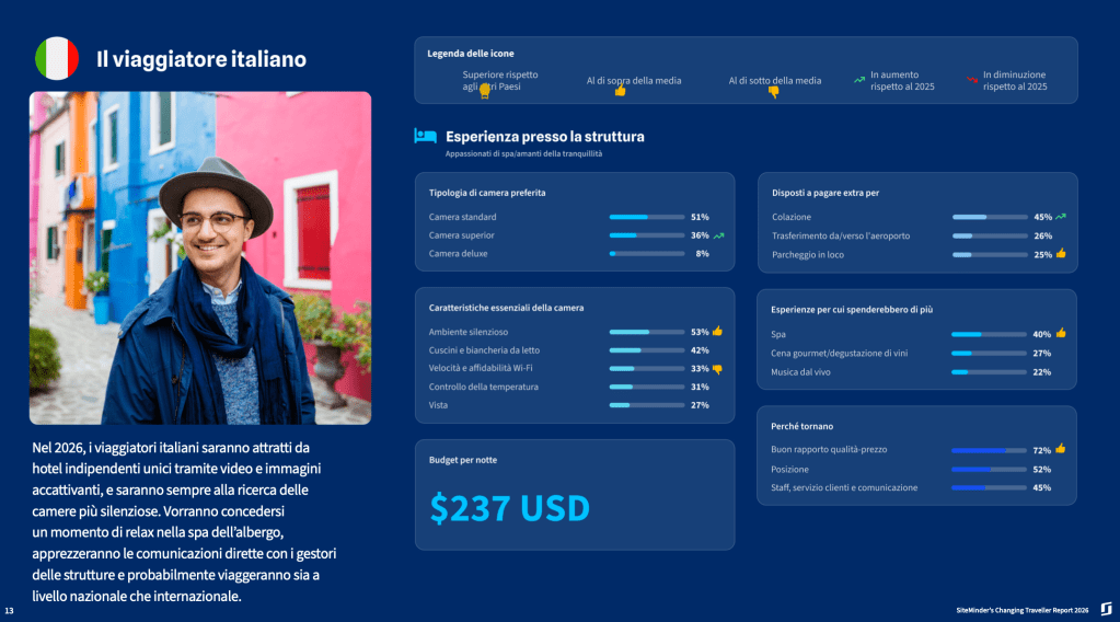 I viaggiatori italiani stanno infatti costruendo i propri viaggi in modo sempre più distintivo e personalizzato. Gli hotel che sapranno comprendere e valorizzare questa diversità saranno, nel prossimo anno, quelli in grado di attrarre e coinvolgere con maggiore efficacia i loro ospiti ideali.