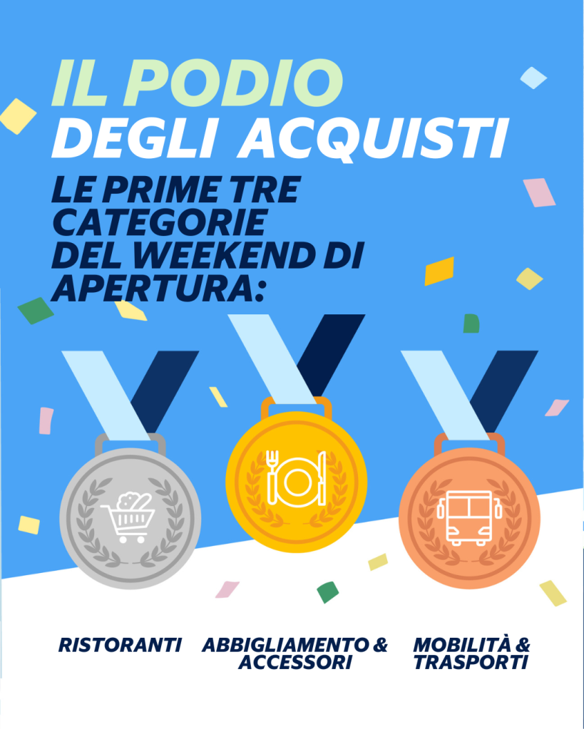 Le prime tre categorie di commercianti che hanno registrato il maggior aumento degli acquisti da parte dei titolari internazionali di carte Visa durante il weekend della Cerimonia di Apertura sono Abbigliamento e Accessori (+35%), seguiti da Ristoranti e Mobilità e Trasporti.