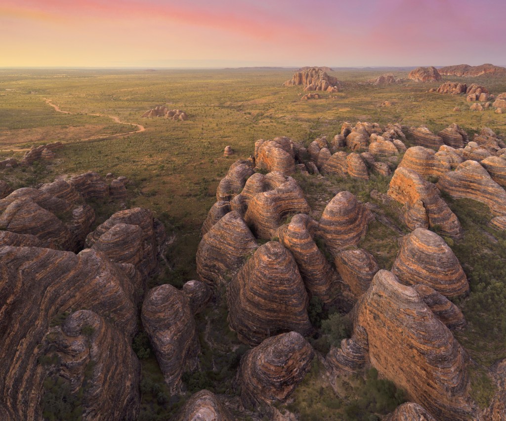 Nel cuore del parco nazionale patrimonio UNESCO Purnululu National Park, le cupole del Bungle Bungle Range si distinguono per le loro caratteristiche striature arancio e nero. Formate nel corso di milioni di anni dall’erosione dell’arenaria, queste strutture naturali creano un paesaggio geometrico unico. Per ammirarne il pattern bizzarro e ricorrente, l’opzione ideale è quella di sorvolare i rilievi a bordo di un elicottero o passeggiare tra le cupole, magari in compagnia di una guida locale per scoprirne tutti i segreti.
