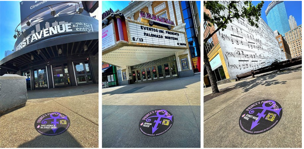 Al di fuori del murale Schmitt Music nel centro di Minneapolis, per esempio, la frase sul Purple Path dice “Il primo manager di Prince, Owen Husney, assunse il fotografo Robert Whitman per scattare l’ormai iconica foto dell’artista diciottenne davanti allo Schmitt Music Mural ed usarla per il materiale promozionale che gli ha portato un importante contratto discografico con la Warner Bros, poche settimane dopo il suo diciannovesimo compleanno”.