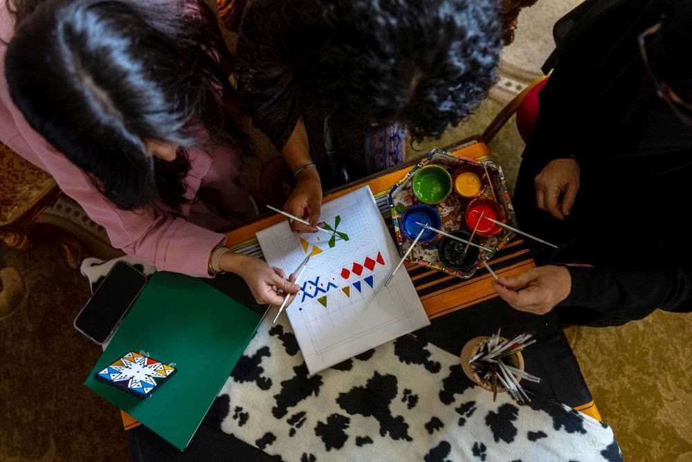 Questa arte nasce da una pratica condivisa: le donne di famiglie, parenti e vicine si riuniscono e dipingono senza schizzi preparatori, usando motivi geometrici, fiori stilizzati e simboli dal profondo significato culturale. È un atto creativo che unisce estetica e funzione sociale – ogni casa diventa una tela viva che riflette ospitalità, orgoglio e appartenenza.