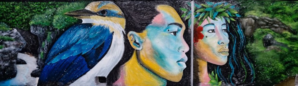 Non lontano dalla Bergman Gallery, lungo il frangiflutti di Nikao che si affaccia sul Parco Marino Marae Moana, sorge la più grande opera murale del Pacifico Meridionale: 560 metri di cemento grigio trasformati in un racconto visivo vivace e potente, affidato all’artista messicano residente a Rarotonga Gonzalo Aldana e all’artista locale Katu Teiti, su iniziativa di Kevin Iro – ex campione di rugby neozelandese e fondatore del Parco – con il supporto del governo delle Isole Cook e del gruppo ambientalista Seacology.