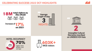 DCT Abu Dhabi ha confermato la crescita delle visite sia leisure che MICE, rivelando che i tassi di occupazione alberghiera per il 2022 hanno superato il 70%, superando la media del Medio Oriente. Ciò ha comportato un aumento del 24% dei pernottamenti in hotel, che hanno raggiunto i 4,1 milioni, rispetto al 2021, mentre la durata media del soggiorno per visitatore è stata di tre notti, con un significativo aumento del 18% su base annua dei ricavi per camera disponibile, rispetto al 2021.mCon una reputazione di lunga data come centro globale per gli affari, la posizione di Abu Dhabi come destinazione principale per gli eventi aziendali è stata rafforzata dall’accoglienza di oltre 600.000 visitatori MICE e dall’ospitalità di 1.210 eventi MICE nel 2022, che hanno messo in mostra le sue sedi, gli hotel e le strutture di supporto leader a livello mondiale.
