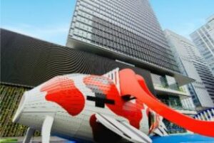 Proprio ai piedi della torre si estende il Tokyo Torch Park, 7 mila metri quadrati di verde pensato come luogo aperto a tutti, che da settembre ospita manifestazioni come fiere di artigianato e un mercato bisettimanale. Nel parco è stato installato un laghetto con 50 esemplari di carpa Nishikigoi, da noi meglio conosciute semplicemente come ‘carpe koi’, in collaborazione con la città di Ojiya (Prefettura di Niigata) dove ebbero per la prima volta origine. Tutto intorno allo stagno, altoparlanti ricreano le atmosfere della campagna riproducendo i suoni ambientali della città di Ojiya. Al centro della piazza è installata una enorme riproduzione di carpa Nishikigoi, che si rivela in realtà uno scivolo per bambini.
