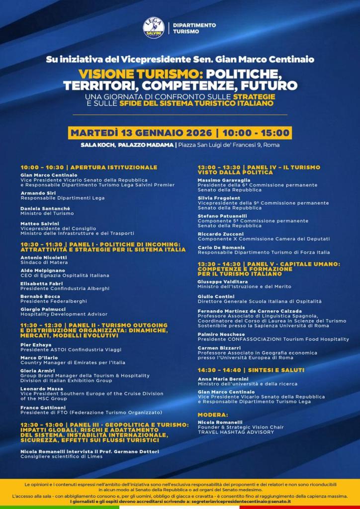 La giornata si concluderà con i saluti della Ministra dell’Università e della Ricerca Anna Maria Bernini, seguiti dall’intervento finale del Vicepresidente Vicario del Senato Gian Marco Centinaio, che offrirà una sintesi delle riflessioni emerse nel corso dei lavori. L’intera giornata sarà moderata da Nicola Romanelli, Founder & Strategic Vision Chair di Travel Hashtag Advisory, che accompagnerà il dibattito e guiderà il confronto tra i relatori.