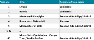 Sono infine 4 le regioni rappresentate con una località ciascuna: la Toscana piazza Abetone/Val di Luce al 17mo posto, la Sicilia Etna Nord al 19mo, il Friuli-Venezia Giulia con Tarvisio – Monte Lussari al 21mo posto e per finire il Molise rappresentato da Campitello Matese in 36ma posizione.