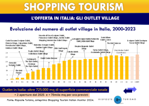 Nel dettaglio, dall’analisi effettuata da Risposte Turismo emerge come dal 2003 ad oggi siano entrati in attività oltre 24 nuovi outlet village (in media, più di un’apertura all’anno), per una superficie commerciale totale che,