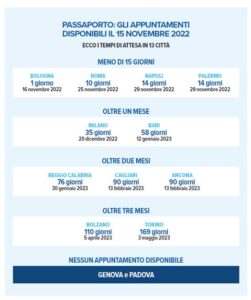 L’indagine è stata svolta provando a prenotare un appuntamento per il rilascio del passaporto sulla piattaforma ministeriale, che fornisce le disponibilità presso i commissariati presenti all’interno della provincia. Per padovani e genovesi il risultato è “non disponibile” per tutte le date possibili in quel momento sulla piattaforma. A Bolzano e a Torino, invece, bisogna aspettare fino ad aprile e a maggio per avere una disponibilità. Tra le città più lente anche Cagliari, Ancona (tre mesi) e Reggio Calabria (due mesi e mezzo).