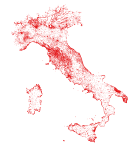 Ciascun alloggio in vendita su Airbnb è stato indicato sulla mappa con un punto rosso; il risultato è una grande macchia, che ha invaso le grandi località turistiche, i capoluoghi, le coste, etc.
