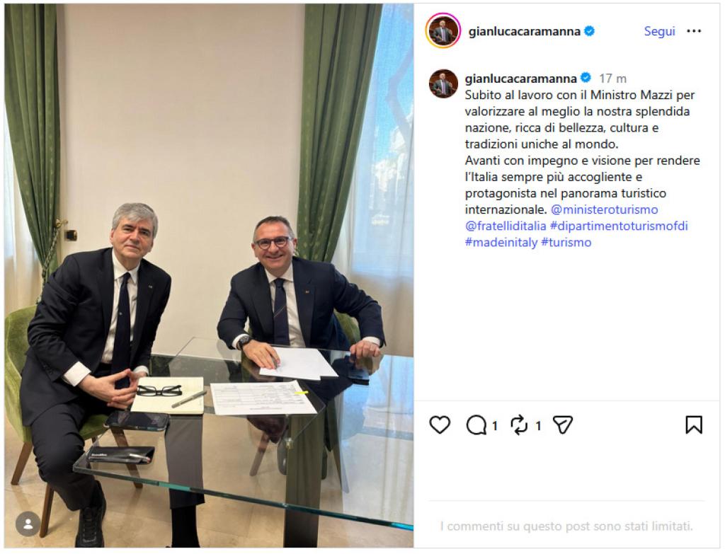 Ad accoglierlo oltre ai dipendenti e l’ufficio stampa c’era Gianluca Caramanna, responsabile del Dipartimento Turismo di Fratelli d’Italia, che sui social ha pubblicato una foto con il neoministro in cui scrive: “Subito al lavoro con il ministro Mazzi per valorizzare al meglio la nostra splendida nazione, ricca di bellezza, cultura e tradizioni uniche al mondo. Avanti con impegno e visione per rendere l’Italia sempre più accogliente e protagonista nel panorama turistico internazionale”.