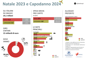 Saranno 13 milioni 253 mila gli italiani che si muoveranno per le vacanze di Natale. Il 95% degli italiani resterà in Italia contro un 5% che sceglierà l’estero. Tra chi rimarrà nel Belpaese, il 55,2% non uscirà dalla propria regione. La classifica delle destinazioni italiane preferite vede in testa la montagna (30,2%), seguita dalle città diverse da quella di residenza (23,4%), dalle località d’arte (19,9%) e dalle località balneari (17,4%). Per la scelta dell’alloggio, resta in pole position la casa di parenti/amici (44,6%), mentre il 22,1% opterà per il comfort della struttura alberghiera. A Natale gli italiani in vacanza dormiranno in media 7,3 notti fuori casa.