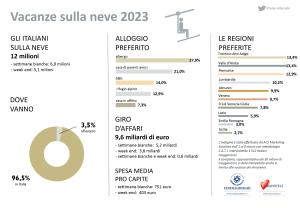 Secondo l’indagine effettuata dall’Istituto ACS Marketing Solutions nel periodo compreso tra il 1 al 6 marzo, sono quasi 12 milioni gli italiani che hanno trascorso o trascorreranno una vacanza sulla neve tra gennaio e marzo 2023. Di questi, 6,9 milioni hanno effettuato o effettueranno la classica settimana bianca, mentre circa 5,1 milioni hanno scelto di concentrare le proprie vacanze nei week end. Il giro di affari complessivo sarà pari a 9,6 miliardi di euro, di questi, 5,2 miliardi sono relativi alle settimane bianche e 3,8 miliardi ai week end.