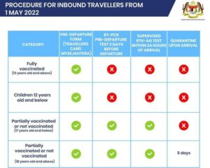 Non sarà più richiesto il check-in tramite l’app di tracciamento MySejahtera e anche le persone non completamente vaccinate potranno entrare nei locali. Solo coloro che sono risultati positivi al virus e hanno ricevuto un ordine di sorveglianza domiciliare non potranno accedere. Le persone che risultano positive a un test COVID-19 potranno uscire anticipatamente dal periodo obbligatorio di quarantena se il test RTK-Ag del quarto giorno, effettuato sotto supervisione professionale, sarà negativo.