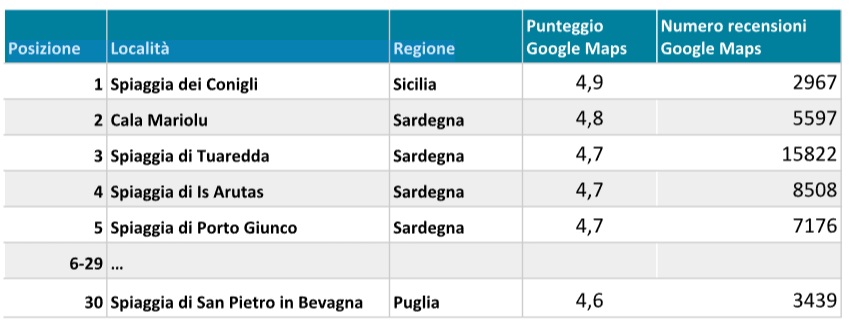 Completano il podio due destinazioni sarde: al secondo posto Cala Mariolu nel comune di Baunei, con un punteggio di 4,8 e oltre 5.500 recensioni, seguita dalla Spiaggia di Tuerredda a Teulada, con 4,7 punti su oltre 15.800 recensioni, il numero più alto in classifica.