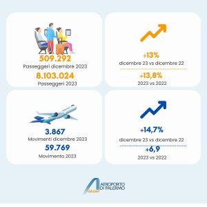 “Il traguardo raggiunto in questo primo mese dell’anno – aggiunge Salvatore Burrafato, presidente di Gesap – è un successo che va ascritto al sistema aeroportuale nel suo complesso, alle donne e agli uomini che ci lavorano ed anche all’ampliamento degli spazi infrastrutturali e operativi, secondo un programma di interventi che abbiamo portato avanti sin dal nostro insediamento. Andiamo avanti così con l’obiettivo di proseguire nella crescita armonica dell’aeroporto per un 2024 che ha tutte le premesse per dimostrare, ancora una volta, la centralità del Falcone Borsellino nelle strategie di sviluppo economico e sociale del nostro territorio”.