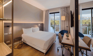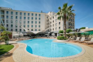 Le 226 camere sono tutte arredate in stile contemporaneo, con calde tonalità di beige e pavimenti in parquet, illuminate da luce naturale e dotate di Wi-Fi gratuito. Ma la struttura dispone anche di un’area meeting al pian terreno, composta da 11 sale riunioni. Si tratta di uno spazio modulabile, flessibile e personalizzabile in grado di ospitare eventi fino a 400 partecipanti. In estate, grazie agli spazi all’aperto, tra cui la terrazza con piscina e i giardini, è possibile ospitare eventi fino a 450 persone.