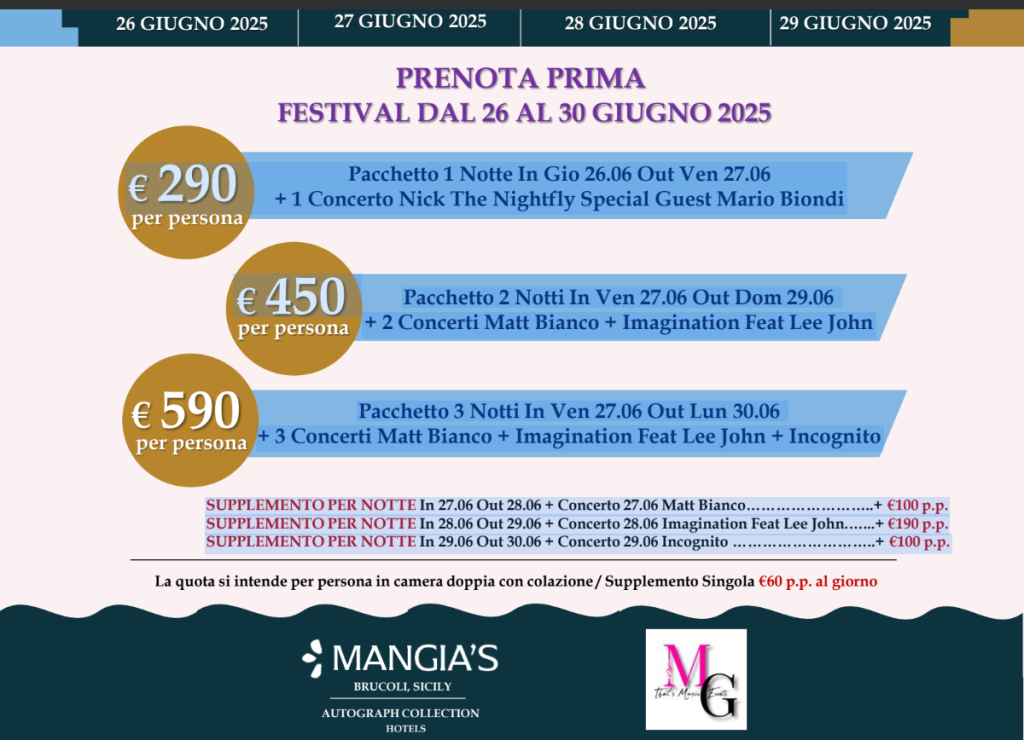 Per l’occasione sono stati realizzati dei pacchetti dedicati per il periodo 26-29 giugno di 1/2/3 notti presso MANGIA’S BRUCOLI AUTOGRAPH COLLECGION RESORT 5 stelle di Brucoli.