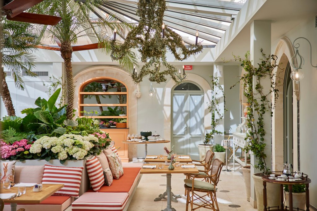 L’Orangerie in stile coloniale, tipica delle case siciliane del Novecento, è il luogo cruciale per l’hotel, con arredi in rattan. Il bar è decorato con carte da parati con trompe l’oeil, che avvolgono l’intero bar, con sedute in velluto per accogliere gli ospiti tra mobili d’epoca, console Luigi XVI, argenterie antiche e una voliera, come nella tradizione delle case siciliane, che rievoca le dimore dell’aristocrazia.