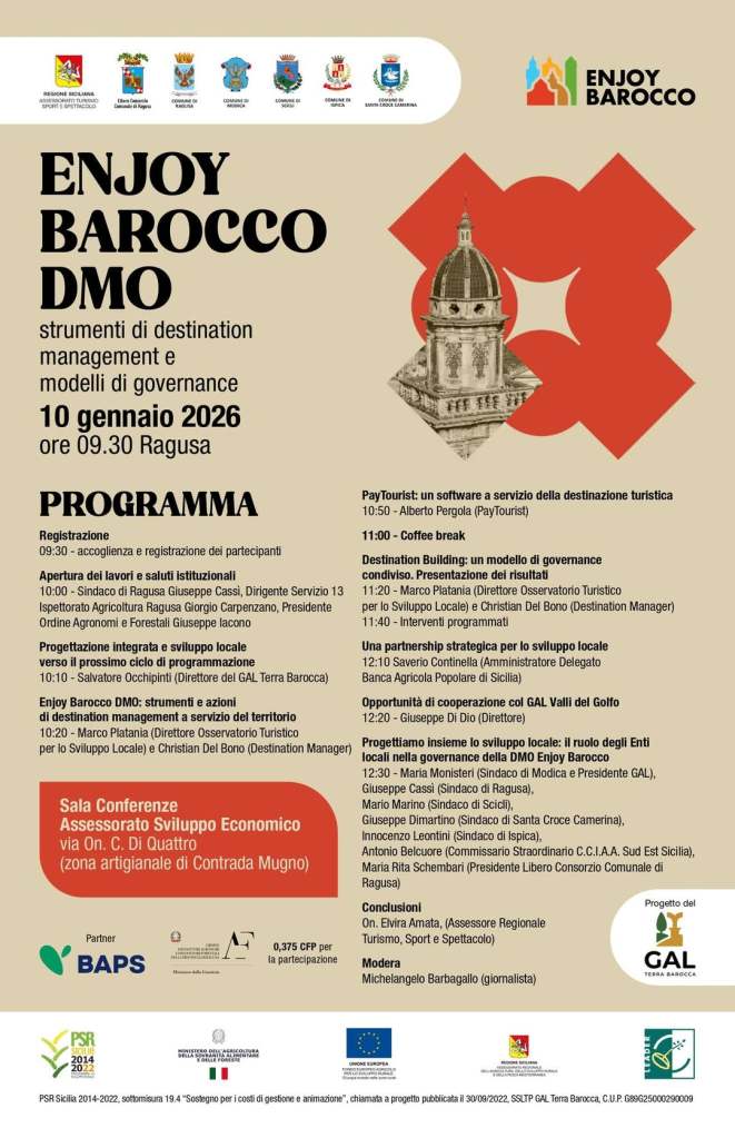 Dopo i saluti istituzionali del sindaco di Ragusa, Peppe Cassì, del dirigente dell’Ispettorato Agricoltura di Ragusa, Giorgio Carpenzano e del presidente dell’Ordine degli Agronomi e Forestali Giuseppe Iacono, si aprirà il ciclo degli interventi tecnici con la relazione di Salvatore Occhipinti, direttore del GAL Terra Barocca, dedicata alla progettazione integrata e allo sviluppo locale in vista del prossimo ciclo di programmazione. A seguire, Marco Platania, docente dell’Università di Catania e direttore dell’Osservatorio Turistico per lo Sviluppo Locale, e Christian Del Bono, destination manager, entreranno nel vivo delle attività della DMO Enjoy Barocco, illustrando strumenti e azioni di destination management già messi in campo a servizio del territorio.