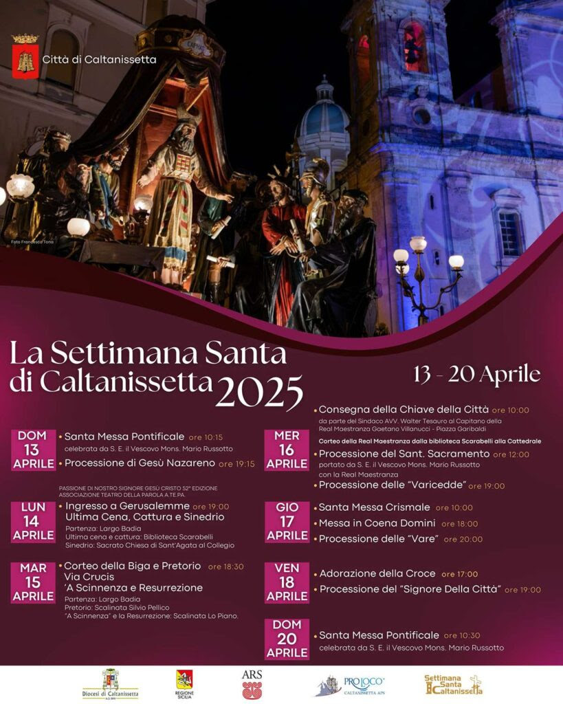 Dal 13 al 20 aprile, Caltanissetta si appresta a vivere uno dei momenti più intensi, identitari e attesi dell’anno: la Settimana Santa, un patrimonio immateriale di fede, cultura e tradizione che ogni anno richiama in città migliaia di fedeli, turisti e appassionati provenienti da ogni parte del mondo.