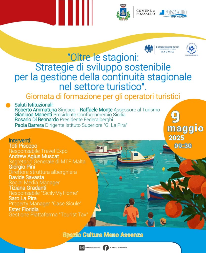Un’importante occasione di confronto per discutere sulla strategie di valorizzazione del territorio e delle imprese turistiche è in programma venerdì 9 maggio alle 9.30 a Pozzallo presso lo Spazio Cultura Meno Assenza dove si terrà il convegno dal titolo “Oltre le stagioni – Strategie di sviluppo sostenibile per la