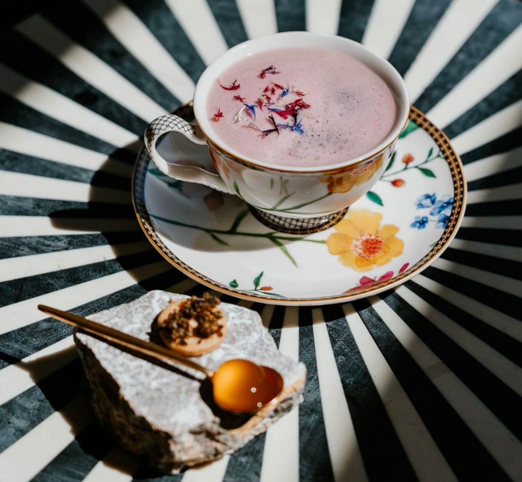 Segue il cocktail vero e proprio, servito in tazza da tè a richiamare l’eleganza del rito pomeridiano anglosassone. La ricetta prevede Tanqueray Ten, Oleum Saccharum, soda ai frutti rossi, rose e karkadè, con velluto di ciliegia in riduzione. Accanto alla tazza, un garnish gastronomico composto da un cookie salato con polvere di cappero disidratato servito su una pietra lavica di Taormina e accompagnato da una sferificazione al whisky 15 y.o., moscato dolce, Peychaud’s Bitters e riduzione di ciliegie.