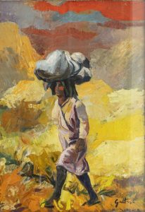 Nella seconda tela, “Contadina” realizzata nel 1956, Guttuso ritrae una donna con un ampio fagotto sul capo che procede con sacrale solennità entro un paesaggio brullo e roccioso. In entrambe le opere viene rappresentata l’epopea degli umili, intenti con estrema dignità e compostezza alla fatica del duro lavoro quotidiano. L’accensione cromatica e l’intensa luminosità del paesaggio, che fa da sfondo alle figure, incarnano pienamente la solarità di quella terra siciliana tanto cara al maestro.