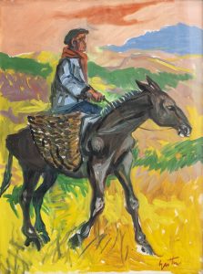 Il primo dipinto, “Contadino in sella a un asino” realizzato nel 1954, costituisce uno studio per un olio di grandi dimensioni dal titolo “L’occupazione delle terre incolte”, espressione di quel “realismo sociale” che ispira un’ampia fetta della produzione del maestro bagherese. Il tema è particolarmente caro al pittore che lo affronta più volte con esiti e linguaggi espressivi differenti: dalla Marsigliese contadina del 1947, di impronta postcubista, alla celebre versione del 1949-50, caratterizzata da una solenne sacralità del racconto e da forti dissonanze cromatiche.