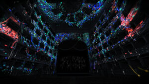 Uno spettacolo avvolgente di musica dal vivo, luci e immagini riflesse, che trasforma la Sala Grande del Teatro con tutte le sue superfici, dai palchi al soffitto, in una grande tela virtuale su cui proiettare in 3d paesaggi visivi e sonori che si sovrappongono in tempo reale ad animazioni e composizioni prodotte in studio.